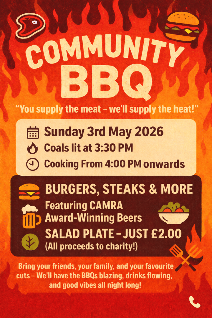 1st BBQ of the Year coming up on the 3rd May Sunday over the Bank Holiday at the village hall… all well come, you bring the Meat we will supply the HEAT Coals lit at 3.30pm cooking starts at 4.00pm
